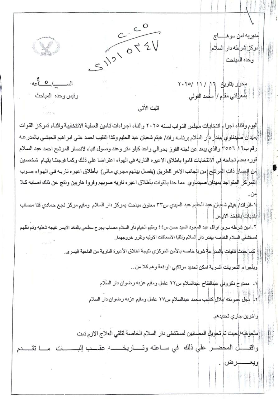 "اليوم واثناء اجراء انتخابات مجلس النواب لسنه ۲۰۲٥ واثناء اجراءات تأمين العملية الانتخابية واثناء تمركز القوات بميدان صيدناوي ببندر دار السلام في محافظة سوهاج برئاسه رائد هيثم شعبان عبد الحليم وكذا النقيب احمد علي ابراهيم الحبشي بالمدرعه رقم ب ١٦ ٣٥٥٦ والذي يبعد عن لجنه الفرز بحوالي واحد كيلو متر وعند وصول انباء لانصار المرشح احمد عبد السلام قوره بعدم نجاحه في الانتخابات قاموا باطلاق الأعيرة النارية في الهواء اعتراضا على ذلك"