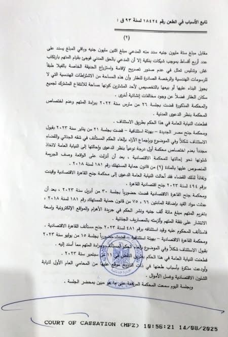 أرست محكمة النقض، مبدأ قانونيا وقضائيا مهما، وهو أنه إذا ارتكب مورد العقار سلوكًا خادعًا يتعلق بخصائص الوحدة العقارية، أو شروط التعاقد، أو الترخيص المتعلق بها، فيجوز تطبيق أحكام قانون حماية المستهلك ومساءلته جنائيًا عن ذلك إلى جانب المسؤولية المدنية، ولا يخرج النزاع تلقائيًا عن دائرة التجريم لمجرد ورود عناصره في نزاع مدني.