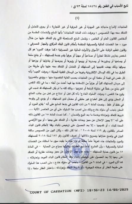 ورأت المحكمة أن قصر النظر على أن النزاع «مدني» والمضيّ معه دون بحث طبيعة السلوك المادي الذي وقع، خطأ في التطبيق والتأويل، لأن المشرّع قصَد أن يجرّم ويعاقب هذا النوع من السلوك لحماية السوق والمستهلكين، واستندت المحكمة أيضًا إلى أن ما آلت إليه درجات التقاضي السابقة وقرار إضافة نصوص قانون حماية المستهلك ضمن مواد الاتهام يؤهل لإلزام المتهم بالعقوبة المنصوص عليها قانونًا.