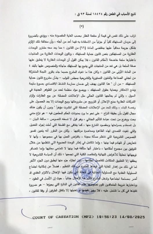 وفي حيثيات حكمها، استعرضت محكمة النقض نصوص قانون حماية المستهلك من تعاريف المستهلك، المنتج، المورد، والسلوك الخادع، ونص المادة 15 التي تحظر الإعلان أو التعاقد على وحدات عقارية قبل الحصول على ترخيص البناء، ونص المادة 9 الذي يحظر السلوك الخادع. وأفادت بأن النصوص تضبط التعامل في سوق العقارات وتُعدّ الوحدات العقارية منتجات خاضعة لأحكام القانون.