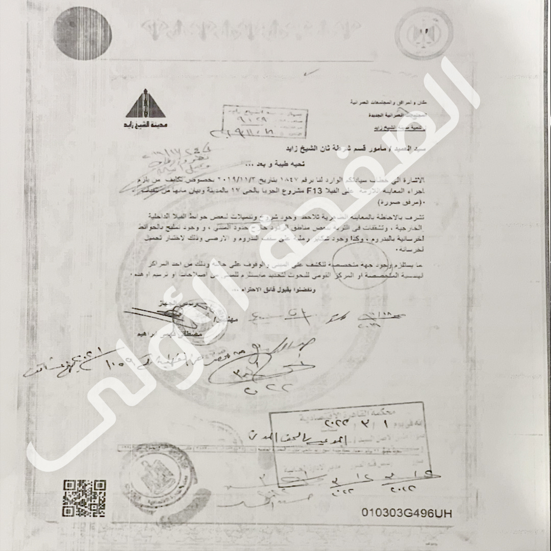 وبالفعل قام مأمور قسم شرطة الشيخ زايد بمخاطبة جهاز المدينة والذى قام بدوره بتشكيل لجنة لمعاينة الفيلا محل الازمة وأثبت الجهاز فى رده على المأمور بانه بالمعاينة ثبت وجود شروخ و تنميلات لبعض الحوائط الداخلية والخارجية وتشققات فى التربة ببعض مناطق الردود.