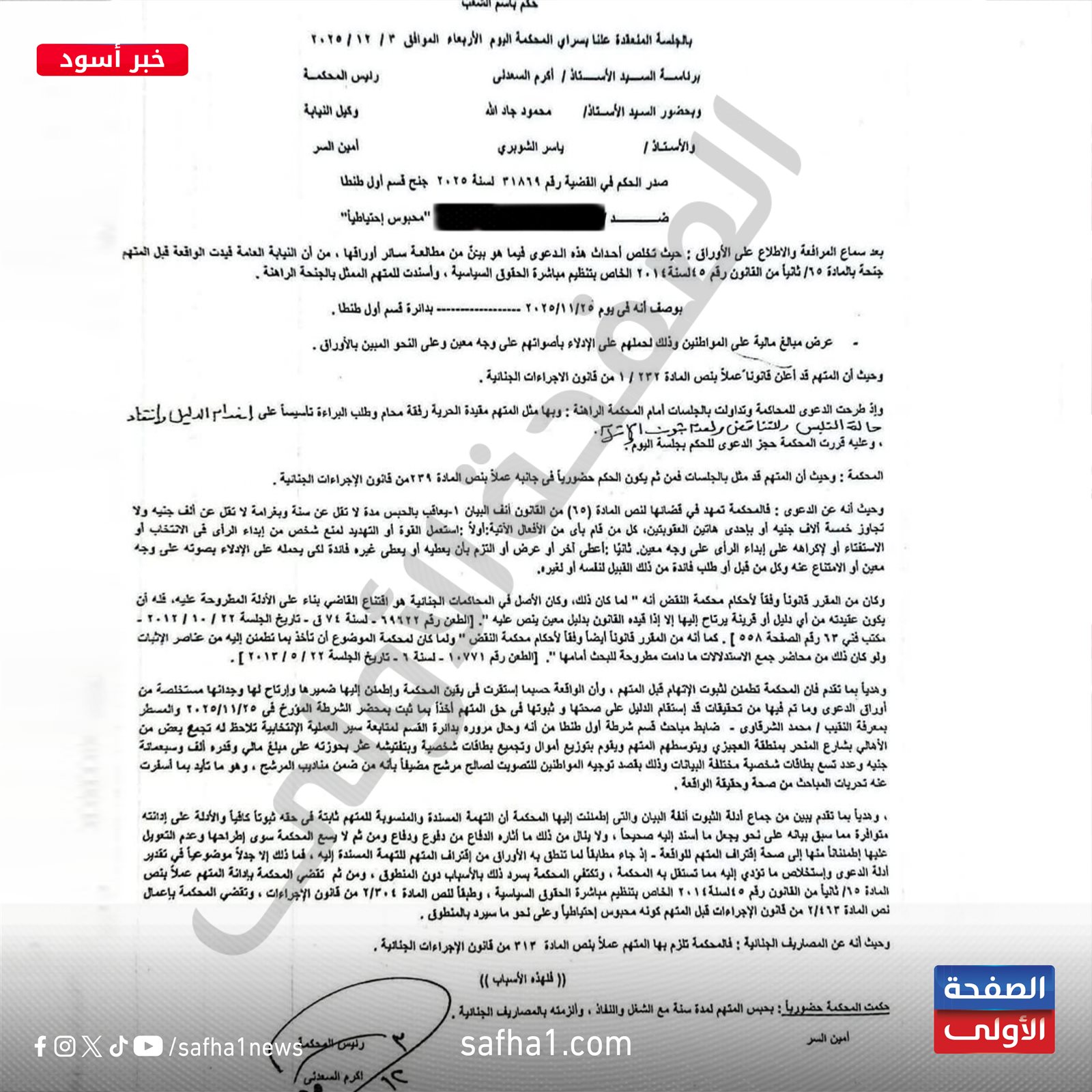 وصدر حكم محكمة جنح أول طنطا، رقم 31869 لسنة 2025 جنح قسم أول طنطا، برئاسة المستشار أكرم السعدني، وبحضور محمود جاد الله، وكيل النيابة، وياسر الشوبري أمين السر.