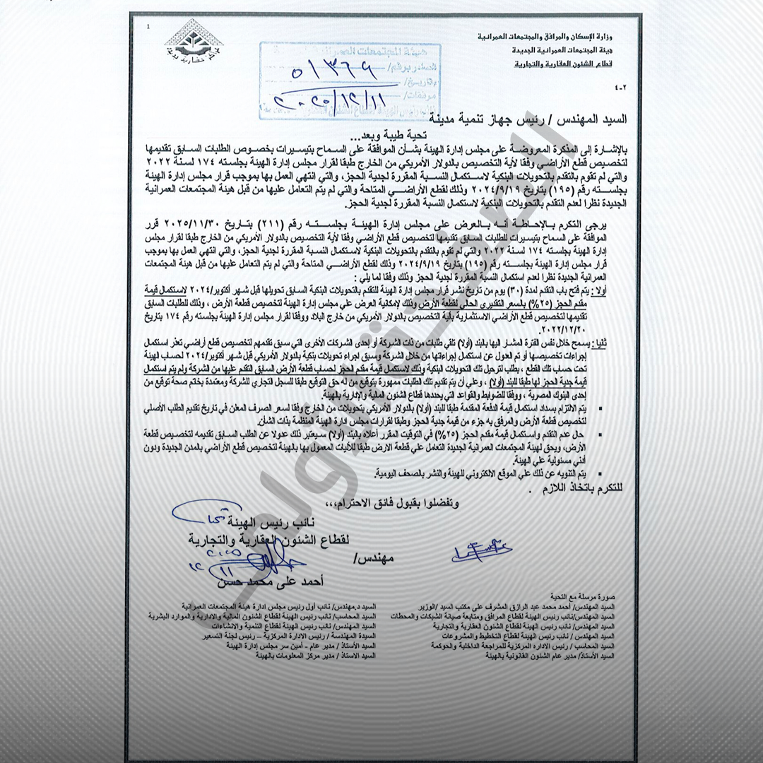 وجاء في قرار هيئة المجتمعات العمرانية الجديدة، أنه بالإشارة إلى المذكرة المعروضة على مجلس إدارة الهيئة بشأن الموافقة على السماح بتيسيرات بخصوص الطلبات السابق تقديمها لتخصيص قطع الأراضي وفقا لأية التخصيص بالدولار الأمريكي من الخارج طبقا لقرار مجلس إدارة الهيئة بجلسته 174 لسنة 2022، والتي لم تقوم بالتقدم بالتحويلات البنكية لاستكمال النسبة المقررة لجدية الحجز، والتي انتهي العمل بها بموجب قرار مجلس إدارة الهيئة بجلسته رقم 195 بتاريخ 19 / 9 / 2024، وذلك لقطع الأراضي المتاحة والتي لم يتم التعامل عليها من قبل هيئة المجتمعات العمرانية الجديدة نظرا لعدم التقدم بالتحويلات البنكية لاستكمال النسبة المقررة لجدية الحجز.