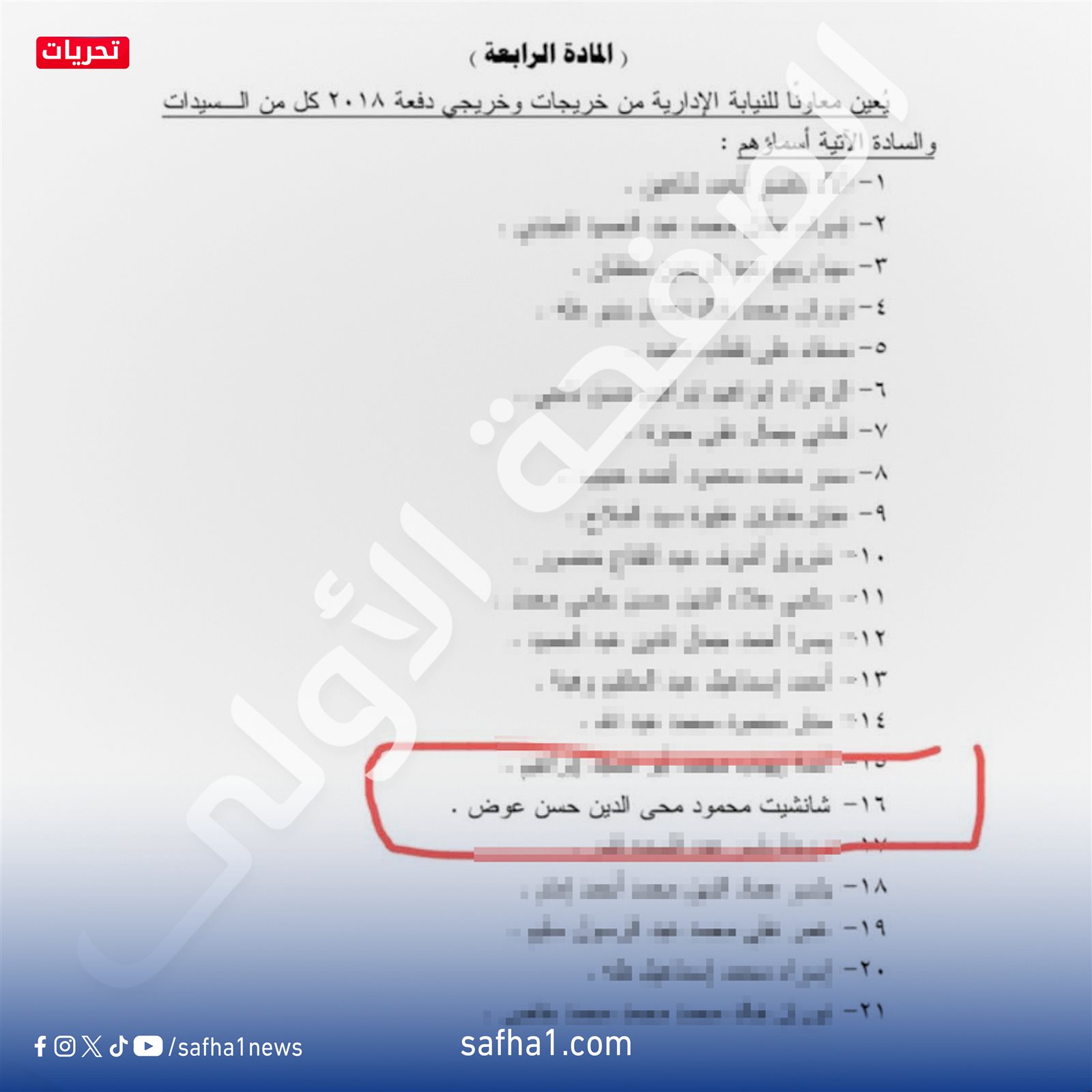 وكشف مصدر لـ «الصفحة الأولى» أن ما بدر من العميد محمود محى الدين حسن عوض، سبب حرجا شديدا لابنته "شانشيت"، فهى معاوناً بهيئة النيابة الادارية ضمن الدفعة أو القرار الأخير الصادر بتعين خريجى دفعة 2018 وتعمل بمقر أول اكتوبر بهيئة النيابة الادارية واسمها بالكامل شانشيت محمود محى الدين حسن عوض، وترتيبها رقم 16 بالقرار الذى حمل رقم 448 لسنة 2025 والصادر بتاريخ 22 أغسطس 2025.
