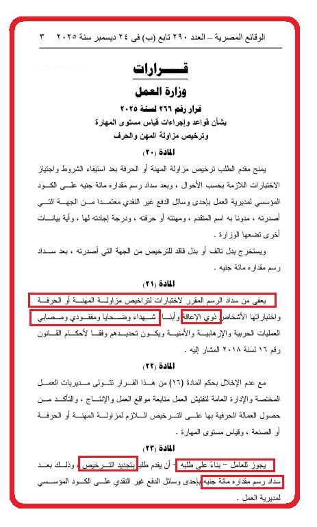 في المقابل، نشرت الوقائع المصرية - العدد 290 تابع (ب) في 24 ديسمبر 2025، قرار وزارة العمل رقم 266 لسنة 2025 بشأن قواعد وإجراءات قياس مستوى المهارة وترخيص مزاولة المهن والحرف.