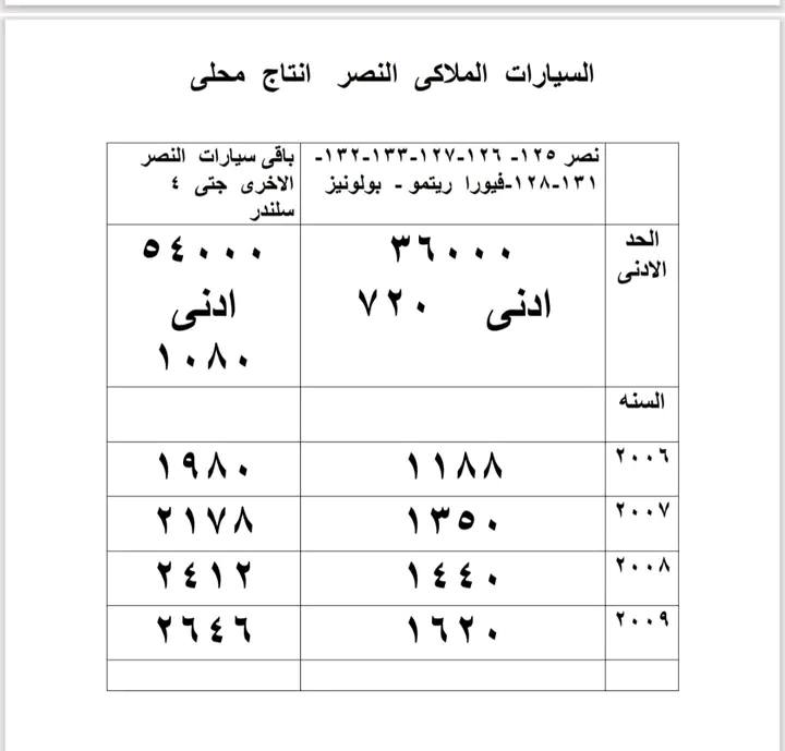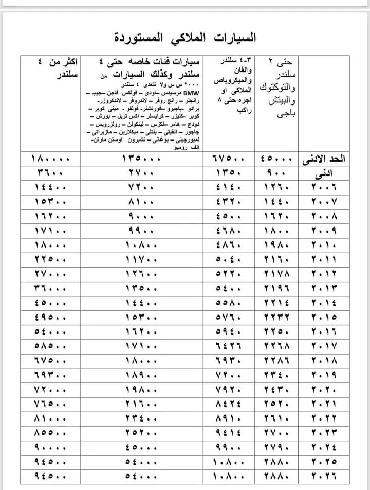 كما شملت الرسوم السيارات المحلية، حيث تم تحديد قيم مختلفة حسب سنة الموديل، على أن تبدأ الرسوم من 720 جنيهًا كحد أدنى.