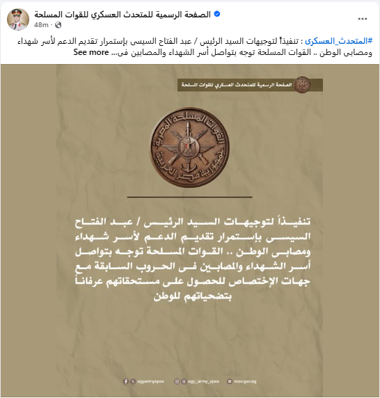 يأتي ذلك تنفيذاً لتوجيهات الرئيس عبد الفتاح السيسى رئيس الجمهورية القائد الأعلى للقوات المسلحة باستمرار تقديم الدعم لأسر شهداء ومصابي الوطن.