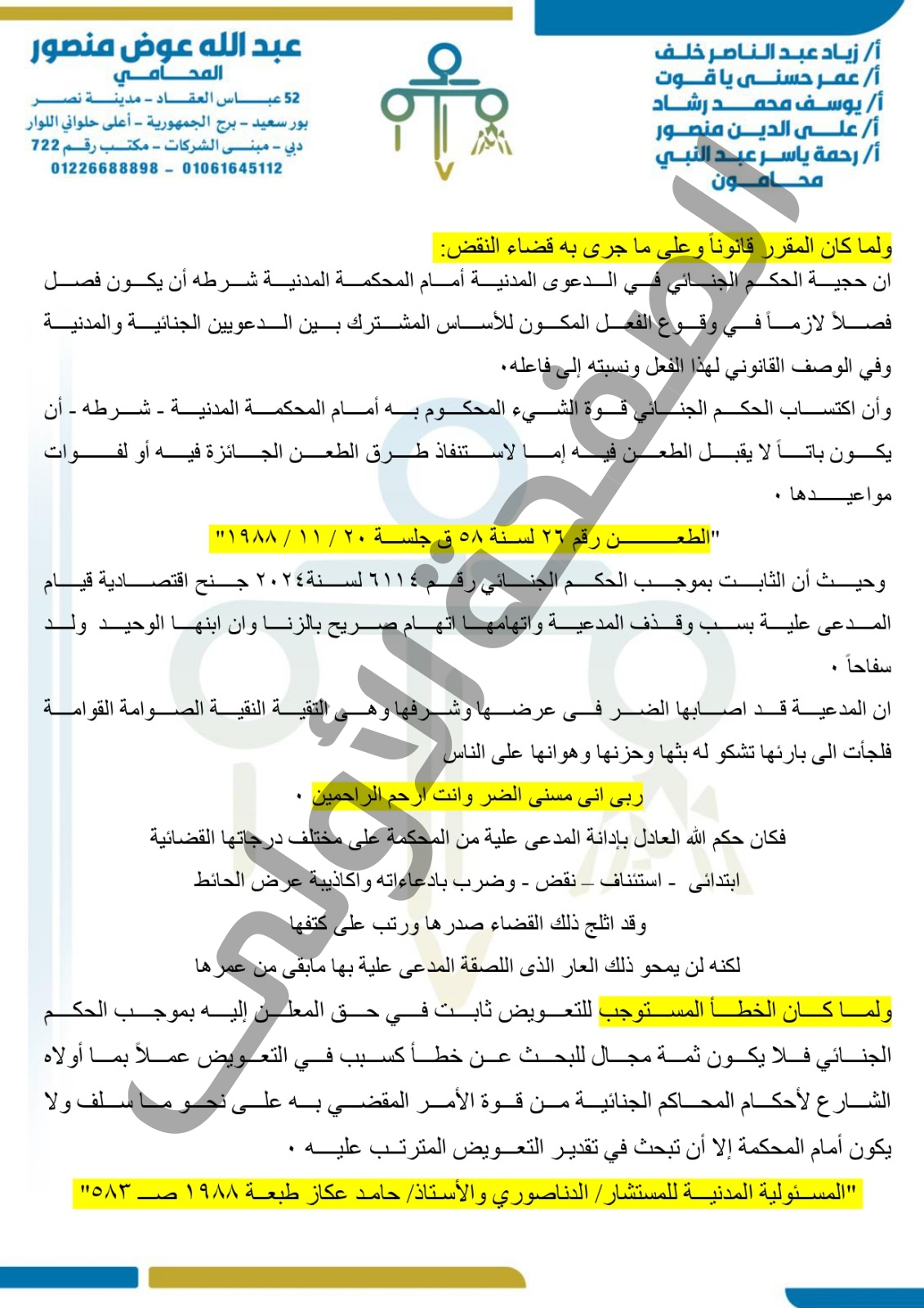 وأضاف المحامي أن موكلته ميار الببلاوي وقع عليه ضررا ماديا بالغ الأثر، تمثل في الغاء العديد من التعاقدات معها كمقدمة برامج دينية، وعدم استضافتها في أي برامج فضائية منذ تلك الواقعة وحتى الآن، ومن المرشح ألا يتم التعاقد معها مستقبلا، بعد وصمة العار التي وصمها بها المدعى عليه، بالإضافة الى هجر زوجها لها، وفسخ خطوبة ابنها، ووفاة عمها، وما تكبدته من مصاريف علاج نفسي وبدني وأتعاب محاماة في الحضور أمام النيابة العامة وأمام محكمة الجنح ومحكمة الجنح المستأنفة ودرجة النقض.