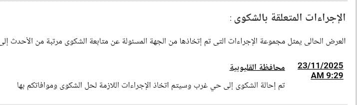 وتم الرد على الشكوى في 23 نوفمبر 2025، من محافظة القليوبية، بإحالة الشكوى إلى حي غرب شبرا الخيمة، على أن يتم اتخاذ الاجراءات اللازمة لحل الشكوى وموافاة مقدميها بها، ومن وقتها لم يتم اتخاذ أي إجراء ملموس على الرض تجاه البناء المخالف في عقار شبرا الخيمة.