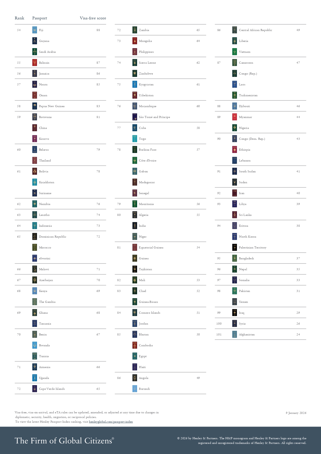 وتذيلت الصومال وباكستان واليمن والعراق وسوريا وأفغانستان المراكز من 97 إلى 101 في ذيل المؤشر، مع قدرة جوازات السفر على زيارة 33، و31، و31، و29، و26، و24 وجهة على الترتيب.