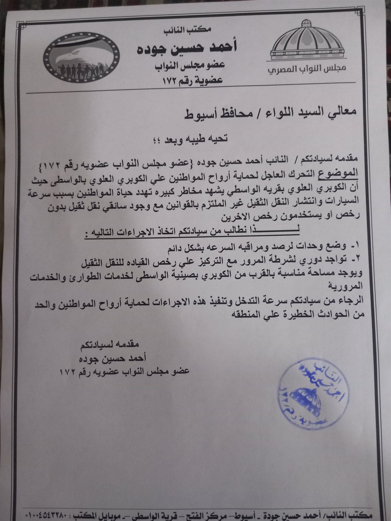 على الجانب الآخر، تقدم النائب أحمد حسين جودة عضو مجلس النواب بطلب إلى محافظ أسيوط ومدير الأمن، مؤكدا أن تكرار الحوادث الخطيرة على الكوبري العلوي بقرية الواسطى المعروف بـ محور الواسطى، يمثل تهديدا مباشرا لحياة المواطنين، مطالبًا باتخاذ إجراءات عاجلة وفورية للحد من هذه الحوادث.