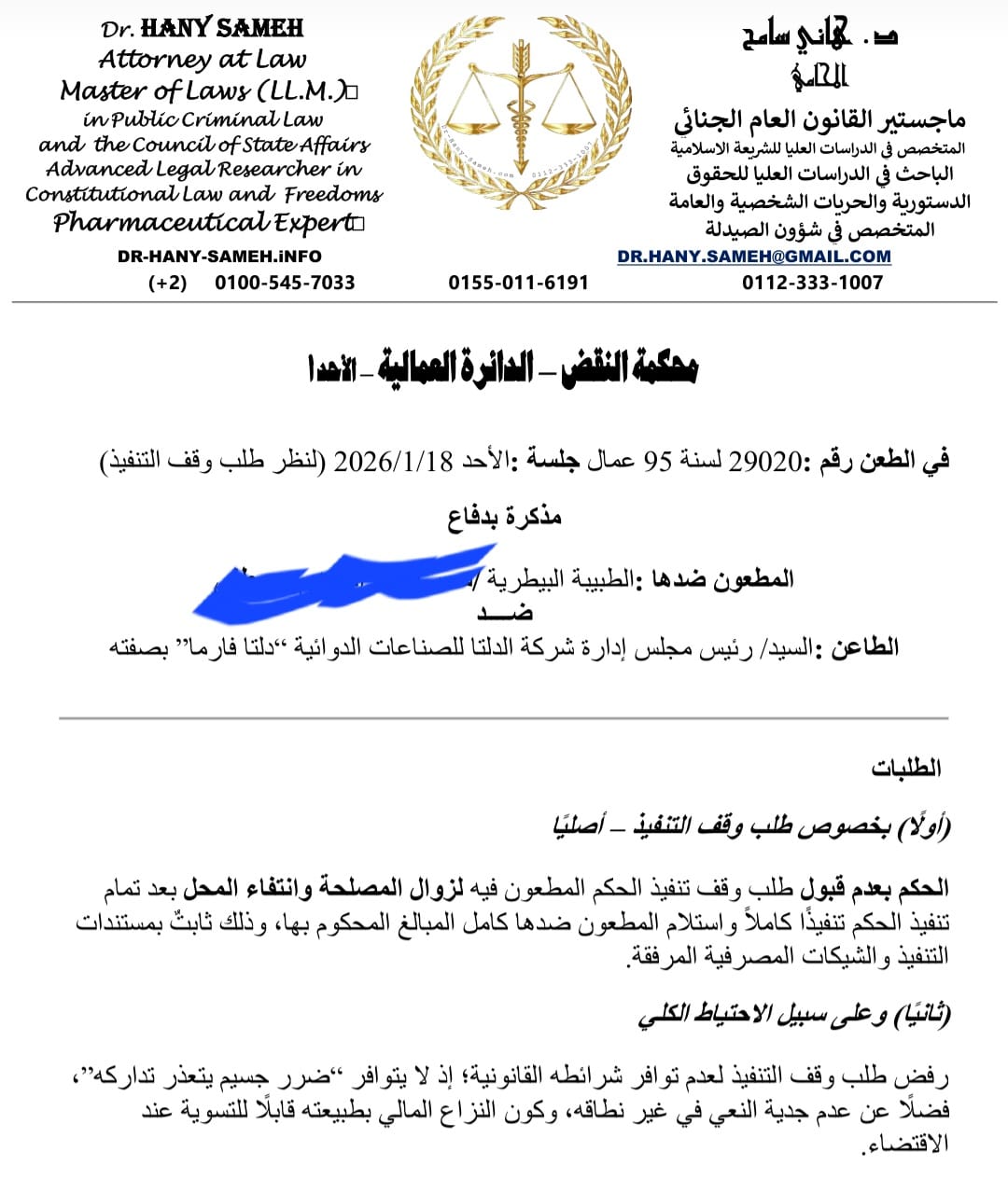 نفذت شركة دلتا فارما للصناعات الدوائية الحكم القضائي النهائي بإلزامها بدفع 1.4 مليون جنيه لمندوبة دعاية طبية، تعويضا عن فصلها، بعدما رفضت محكمة النقض طلب وقف تنفيذ الحكم، وأكدت أحقية المدعية في التنفيذ.