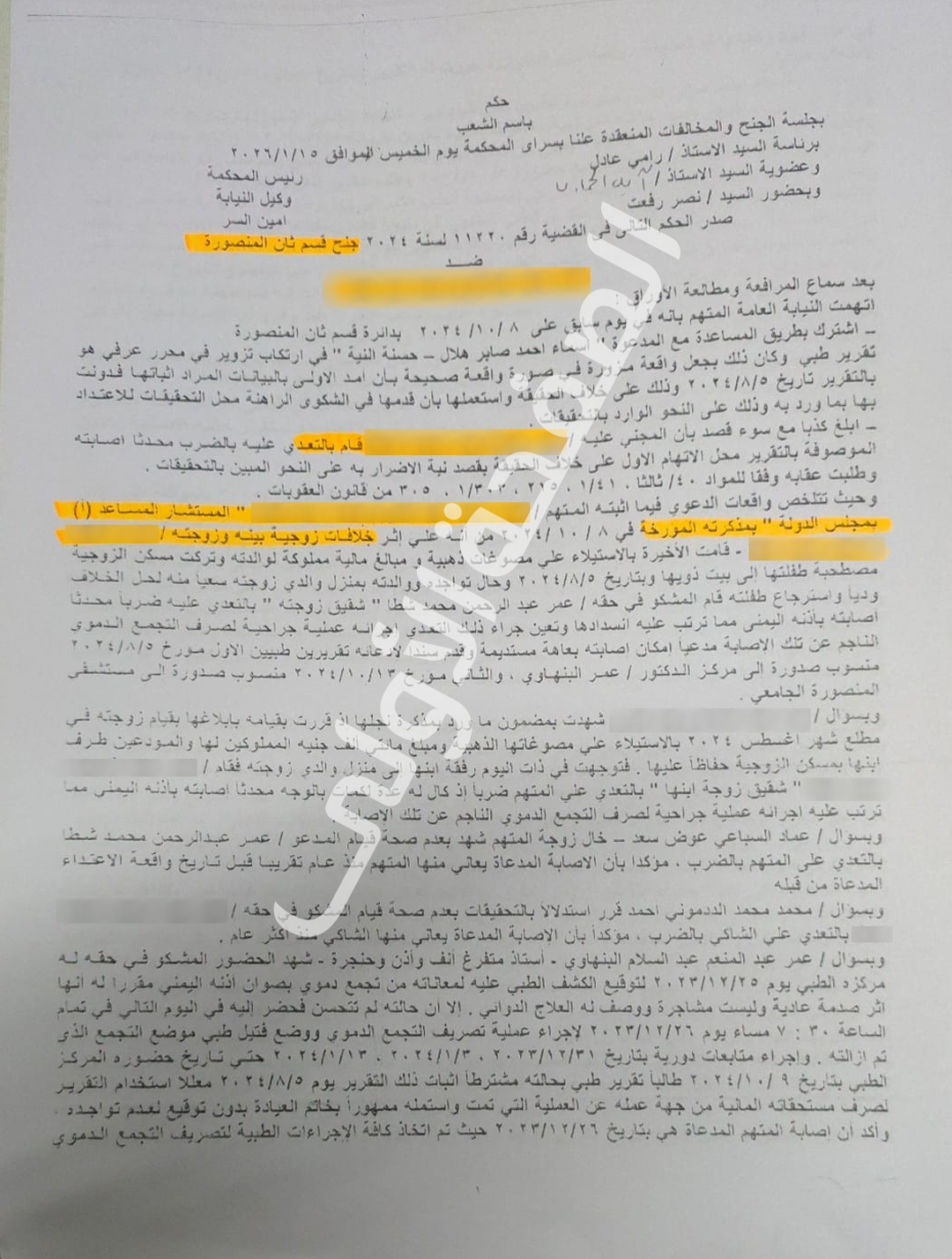 وحكمت محكمة جنح المنصورة، على مستشار في مجلس الدولة، بالحبس 6 أشهر مع الشغل وكفالة ألف جنيه لإيقاف التنفيذ، وتغريمه 5 آلاف جنيه ودفع مبلغ مساو كتعويض مدني مؤقت، بتهمة تزوير محرر عرفي "تقرير طبي"، والبلاغ الكاذب باتهام شقيق زوجته بالتعدي عليه بالضرب، على خلاف الحقيقة، بقصد الإضرار به.