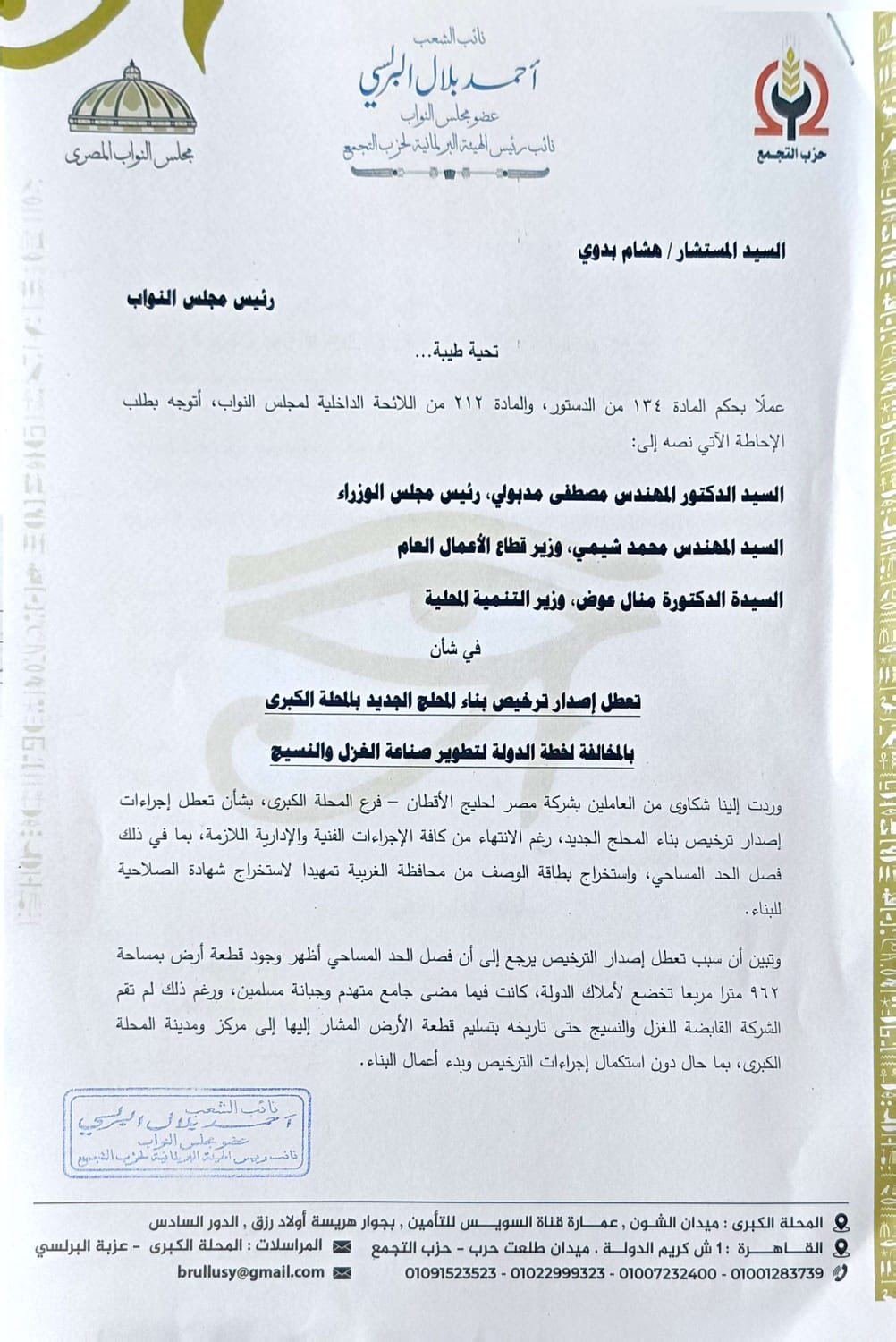 وقال بلال : ردت إلينا شكاوى من العاملين بشركة مصر لحليج الأقطان – فرع المحلة الكبرى، بشأن تعطل إجراءات إصدار ترخيص بناء المحلج الجديد، رغم الانتهاء من كافة الإجراءات الفنية والإدارية اللازمة، بما في ذلك فصل الحد المساحي، واستخراج بطاقة الوصف من محافظة الغربية تمهيدا لاستخراج شهادة الصلاحية للبناء.