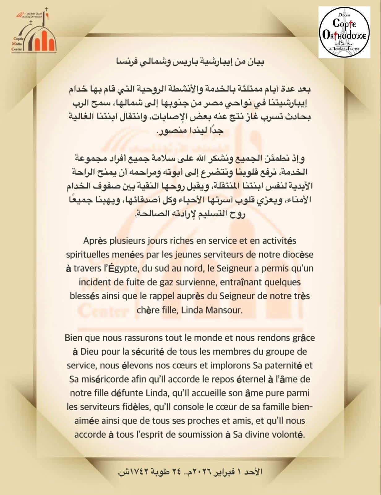 وأصدرت إيبارشية باريس وشمال فرنسا بيانا رسميا حول ملابسات الحادث اليم، ونعت فيه ابنتها الخادمة ليندا منصور، التي انتقلت إلى الأمجاد السماوية إثر حادث تسرب غاز أليم تعرضت له مجموعة الخدمة التابعة للإيبارشية أثناء وجودهم في أسوان.