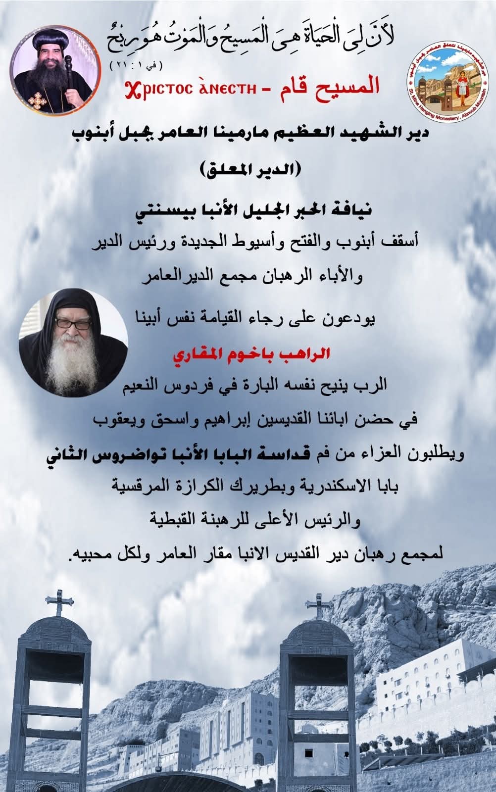 من المفارقات الغريبة أن يجمع الموت بين راهبين لا ينتميان للدير ذاته، لكنهما التقيا في موعد واحد، فلبيا نداء السماء دون مقاومة، وكأن لسان حالهما يقول: "تعددت الأسباب والموت واحد".