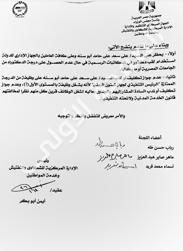 أولا: - يحظر على علي سعد على حامد أبوسنه وعلى كافة العاملين بالجهاز الإداري للدولة استخدام لقب دكتور في المكاتبات الرسمية في حال عدم الحصول على درجة الدكتوراه من الجامعات المصرية أو ما يعادلها.