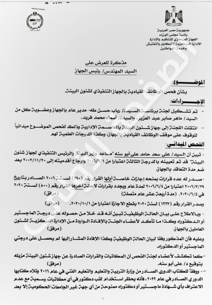 وفي هذا السياق، حصلت «الصفحة الأولى» على المستندات التي تكشف اسباب اقالة «أبو سنة» من موقعه، حيث كشفت مذكرة للعرض على المهندس رئيس الجهاز المركزي للتنظيم والإدارة الادارة المركزية للشكاوى والتفتيش وخدمة المواطنين، بشأن فحص الوظائف القيادية بالجهاز التنفيذي لشئون البيئة، بعد تشكيل لجنة برئاسة رباب حسن طه مدير عام بالجهاز وعضوية كل من ماهر صابر عبد العزيز، وأسماء محمد فريد.