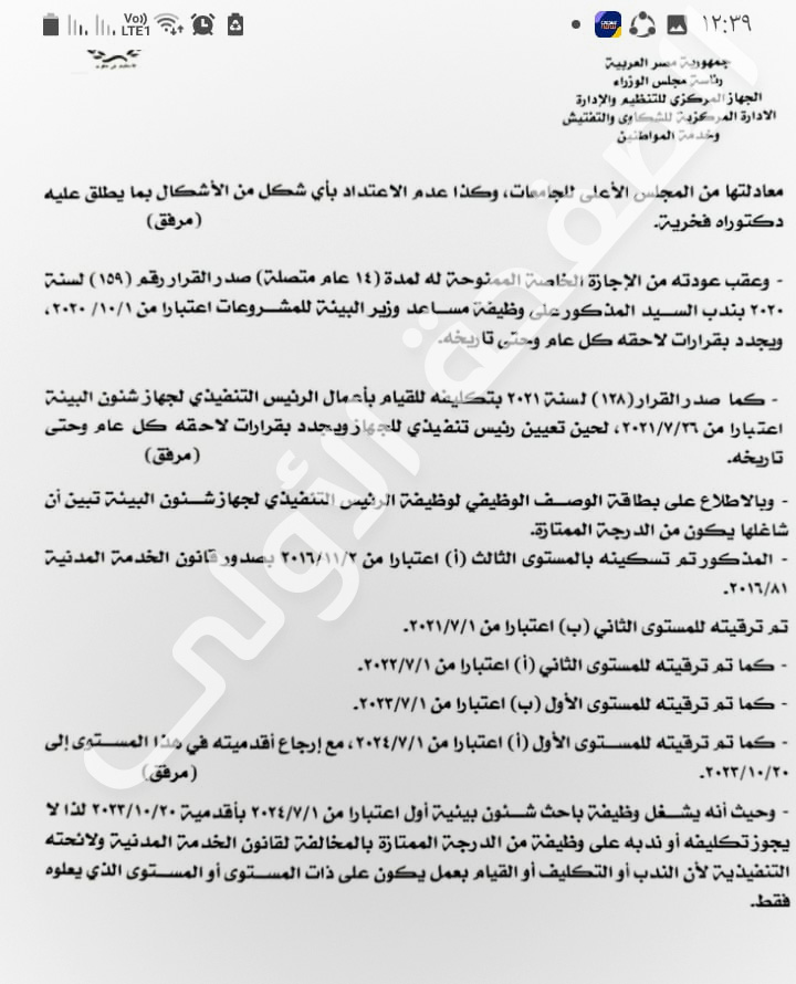 وعقب عودته من الإجازة الخاصة الممنوحة له لمدة (١٤) عام متصلة) صدر القرار رقم (١٥٩) لسنة لندب المذكور على وظيفة مساعد وزير البيئة للمشروعات اعتبارا من ۲۰۲۰/۱۰/۱، وتجدد بقرارات لاحقه كل عام وحتى تاريخه، معادلتها من المجلس الأعلى للجامعات، وكذا عدم الاعتداد بأي شكل من الأشكال بما يطلق عليه دكتوراه فخرية، وعقب عودته من الإجازة الخاصة الممنوحة له لمدة (١٤) عام متصلة صدر القرار رقم (١٥٩) لسنة ۲۰۲۰ بندب المذكورعلى وظيفة مساعد وزير البيئة للمشروعات اعتبارا من ۱۰/۱/ ۲۰۲۰ ويجدد بقرارات لاحقه كل عام وحتى تاريخه.