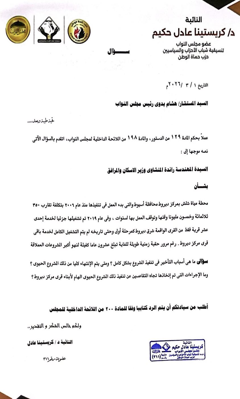 وطالبت النائبة كريستينا عادل حكيم، وزارة الإسكان بكشف الأسباب الحقيقية وراء تأخير التنفيذ الكامل، وتحديد موعد قاطع للانتهاء من المشروع كلياً. كما تساءلت عن الإجراءات الرادعة التي تم اتخاذها تجاه المتقاعسين عن تنفيذ هذا المرفق الهام الذي يمس حياة الآلاف من أبناء قرى مركز ديروط، مطالبة برد كتابي رسمي من وزارة الإسكان يوضح خطة التحرك العاجلة لإنهاء هذه المعاناة المزمنة.