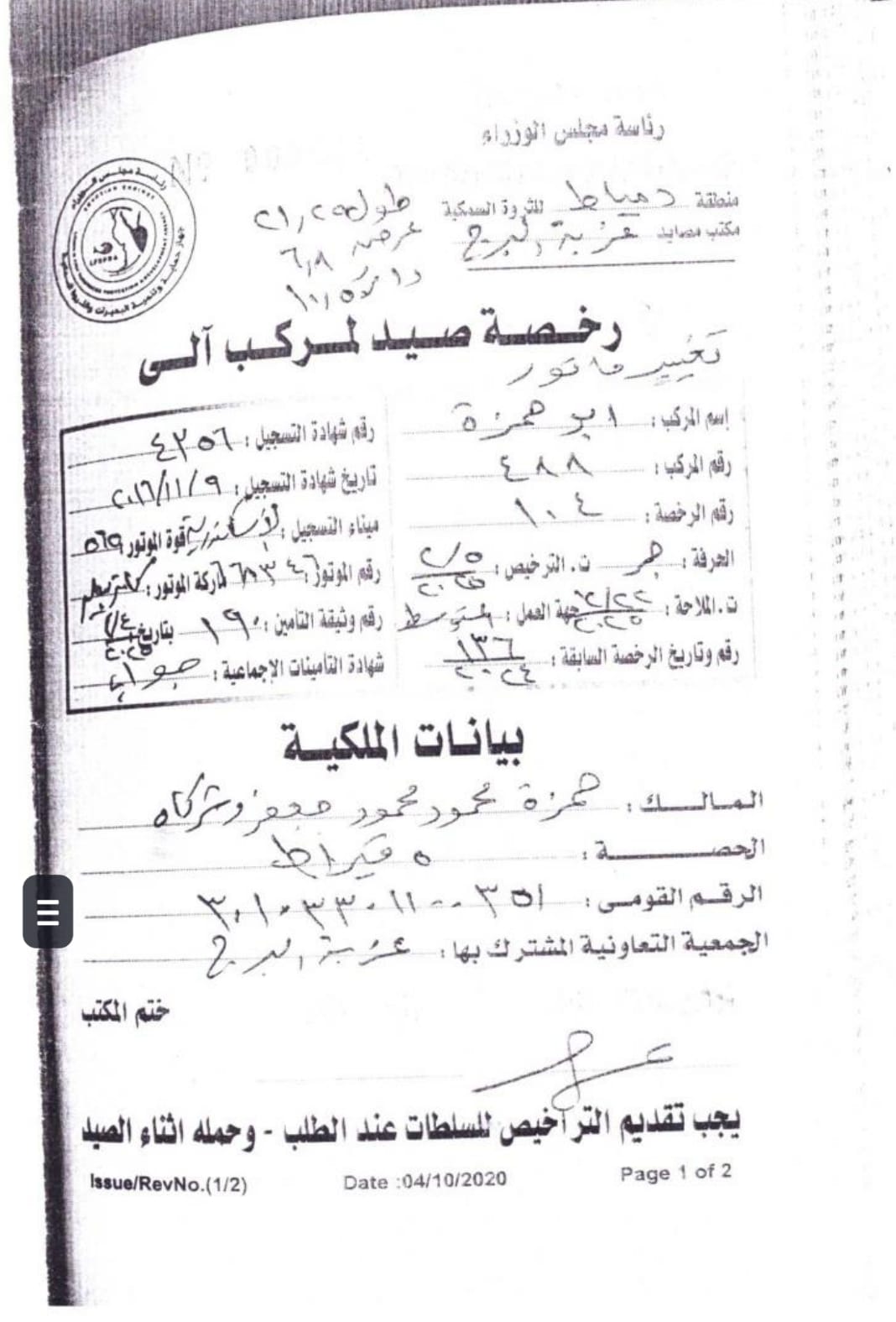 وكشفت بيانات رخصة صيد مركب أبو حمزة الغارق عن تسجيلها بتاريخ 9 نوفمبر 2016، ورقم المركب 488 ورقم الرخصة 104، وتابعة لمكتب مصايد عزبة البرج التابع لمنطقة دمياط للثروة السمكية، وأن طول المركب 21.25 متر، والعرض 6.8 متر، ومالكها حمزة محمود محمود جعفر وشركاه.