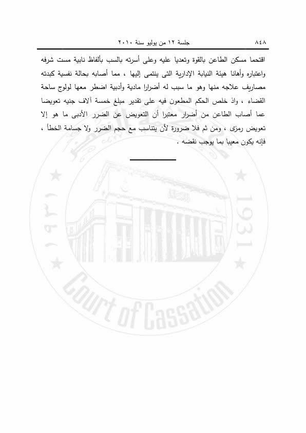 وأضافت النقض أن الحكم المطعون فيه خفض التعويض إلى مبلغ زهيد على سند أن التعويض الأدبي رمزي ولا يلزم تناسبه مع جسامة الخطأ، فإنه يكون قد أخطأ في تطبيق القانون، ولذلك قضت المحكمة بـ نقض الحكم المطعون فيه، لمخالفته القانون وخطئه في تقدير التعويض الأدبي، مع الإحالة.