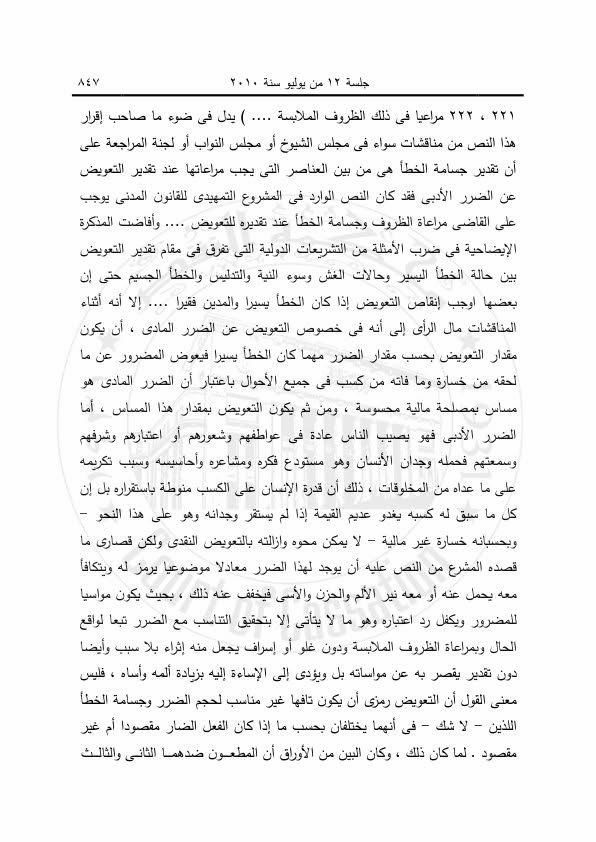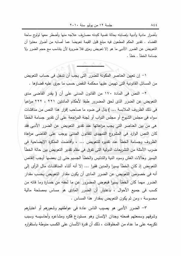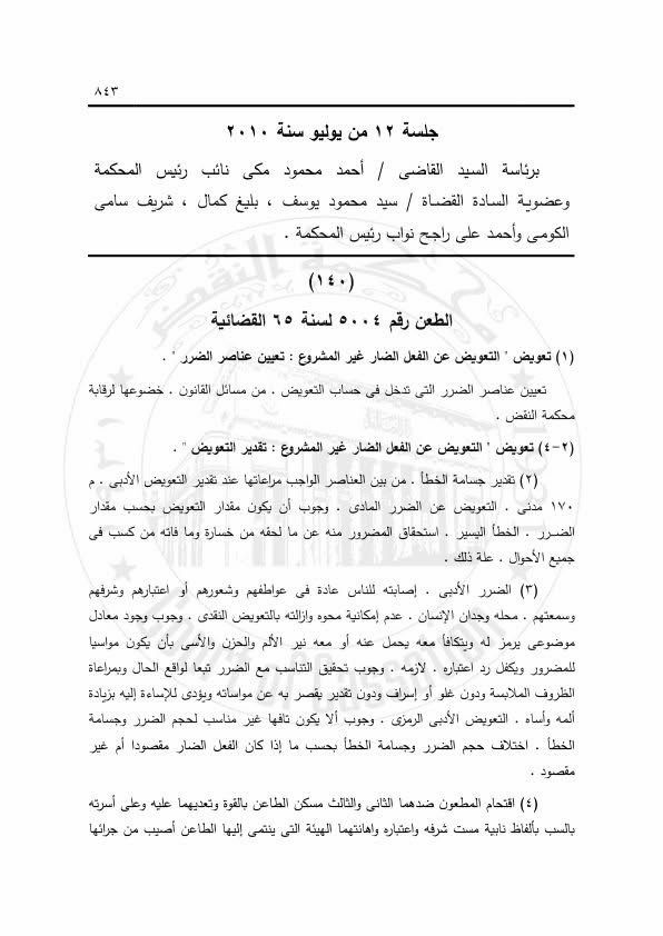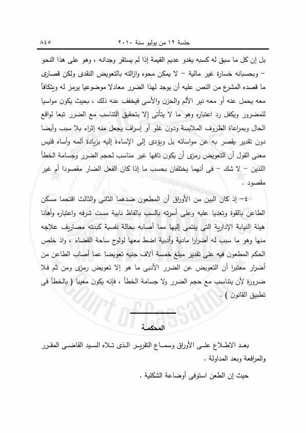 وقالت محكمة النقض في حيثيات الحكم إن تحديد عناصر الضرر الداخلة في حساب التعويض مسألة قانونية تخضع لرقابة محكمة النقض، وإن النص في المادة 170 مدني يوجب على القاضي مراعاة الظروف الملابسة عند تقدير التعويض، ومن بينها جسامة الخطأ، خاصة في التعويض عن الضرر الأدبي.