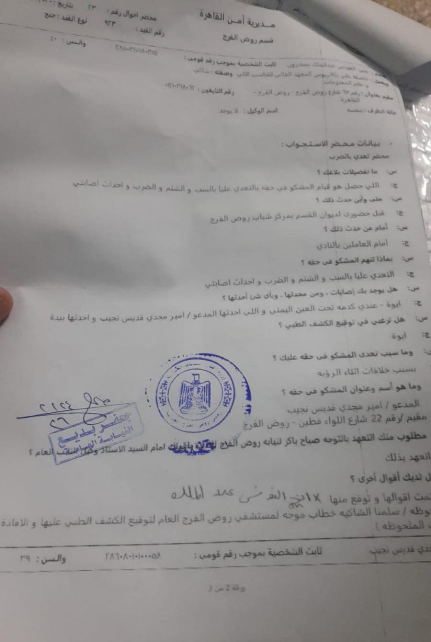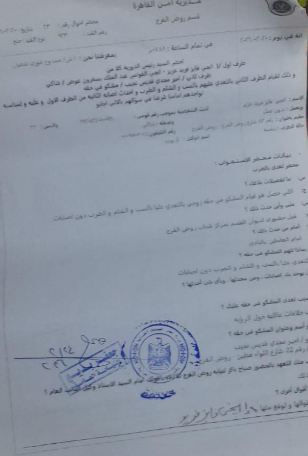 حررت إ - ف محضر رقم ٢١٢٤ لسنة٢٠٢٦(جنح روض الفرج) ضد زوجها أ - م واتهمته خلاله بـالاعتداء عليها بالسب والضرب خلال جلسة الرؤية الأسبوعية المعتادة لأبنائه بمركز شباب روض الفرج وذلك على مرأى ومسمع من العاملين بالنادي.