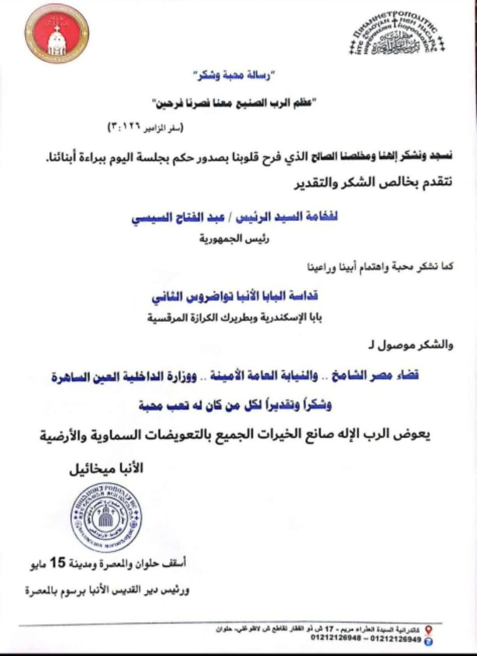 وأصدر الأنبا ميخائيل (أسقف حلوان والمعصرة ومايو) بيان رسمي (حصلت الصفحة الأولى على صوره منه) يوجه خلاله الشكر للرئيس السيسي والسلطات القضائية لتطبيقها لصحيح القانون والعدالة تحت عنوان "رسالة محبة وشكر"، مسترشدا بسفر المزامير (3:126) "عظم الرب الصنيع معنا فصرنا فرحين".