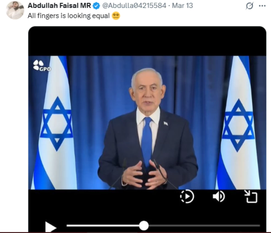 كما ظهرت تعليقات أخرى تشكك فى حقيقة فيديو خطاب نتنياهو الأخير عن مستجدات الحرب على إيران، وقالت إنه مصنوع باستخدام تقنيات الذكاء الاصطناعي، وشككت تلك التعليقات فى وجود "بيبي" على قيد الحياة، مع ظهور لقطات تكشف عن وجود 6 أصابع في يده، كما تظهر تلك الأصابع وهي متساوية بشكل غير طبيعي، لتفجر تلك اللقطات حالة الجدل حول مقتل نتنياهو أو بقائه على قيد الحياة.