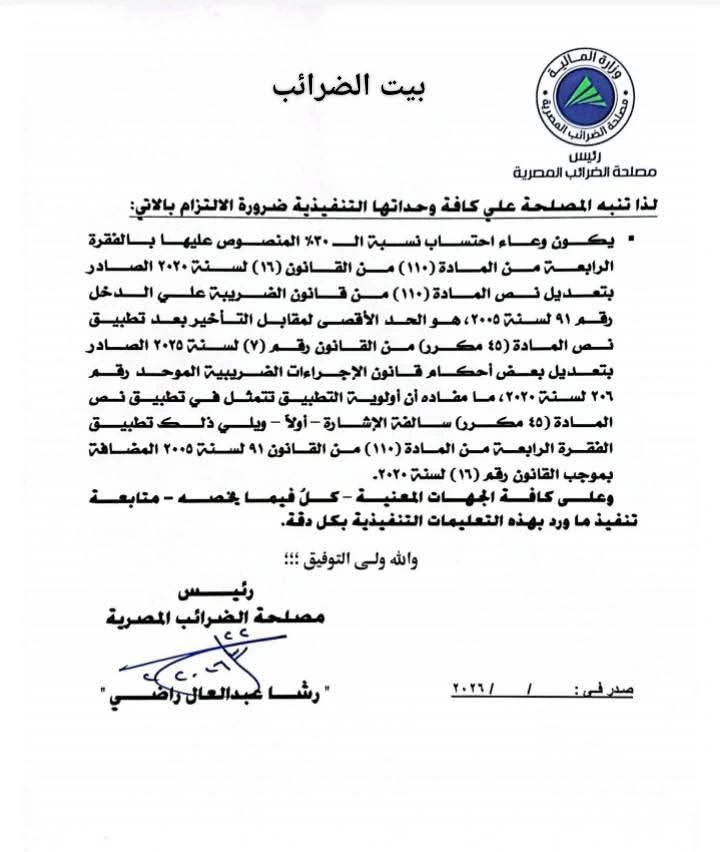 أصدرت مصلحة الضرائب التعليمات التنفيذية رقم 8 لسنة 2026، والتي جاءت استدراكا للتعليمات التنفيذية رقم (17) لسنة 2025، في إطار الحرص على التطبيق السليم والدقيق لأحكام القوانين المنظمة لمبادرة التسهيلات الضريبية، وضمان وضوح الرؤية وتوحيد التطبيق داخل كافة الوحدات التنفيذية.