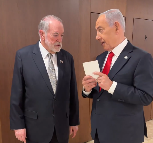 نشر رئيس حكومة الاحتلال الإسرائيلي بنيامين نتنياهو مقطع فيديو يوثق لقاءه مع السفير الأميركي في تل أبيب، مايك هاكابي، وخلال الفيديو المنشور على موقع X، أخرج نتنياهو ورقة مكتوب فيها “قائمة أهداف” من جيبه وعرضها على هاكابي، قائلا إنها تتضمن أسماء مسؤولين بارزين في النظام الإيراني مستهدفين بالتصفية.