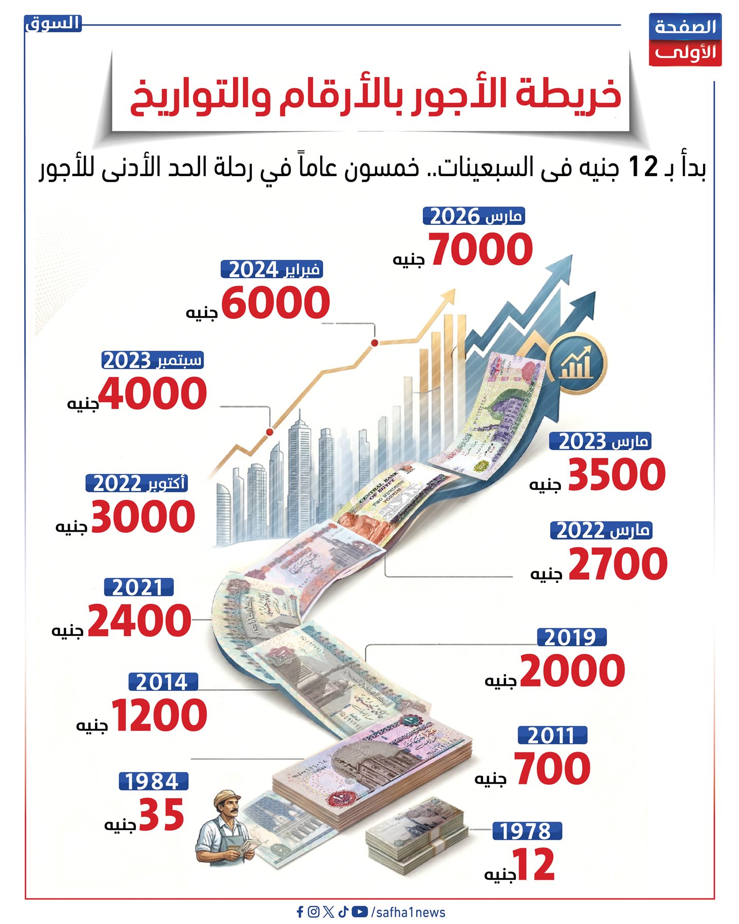وجاءت المحطة التاريخية الأضخم في فبراير 2024، ضمن حزمة الحماية الاجتماعية الكبرى، حيث تقرر رفع الحد الأدنى للأجور بنسبة 50% ليصل إلى 6000 جنيه، قبل أن يستقر حالياً عند مستوى 7000 جنيه.