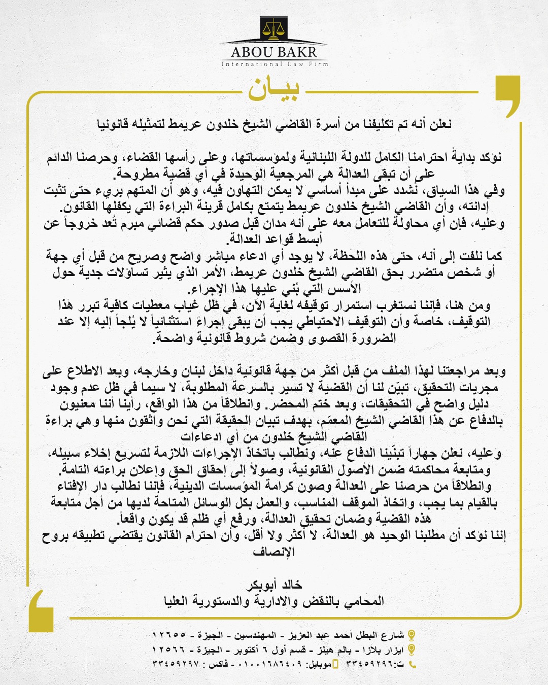 وكشف "أبو بكر" عن أنه بعد مراجعة ملف قضية القاضي خلدون عريمط من قبل أكثر من جهة قانونية داخل لبنان وخارجه، وبعد الاطلاع على مجريات التحقيق، تبيّن أن القضية لا تسير بالسرعة المطلوبة، لا سيما في ظل عدم وجود دليل واضح في التحقيقات، وبعد ختم المحضر، وانطلاقاً من هذا الواقع، رأى المحامي الدولي أنه معني بالدفاع عن هذا القاضي الشيخ المعمّم، بهدف تبيان الحقيقة، وهو واثق منها، وهي براءة خلدون من أي ادعاءات.