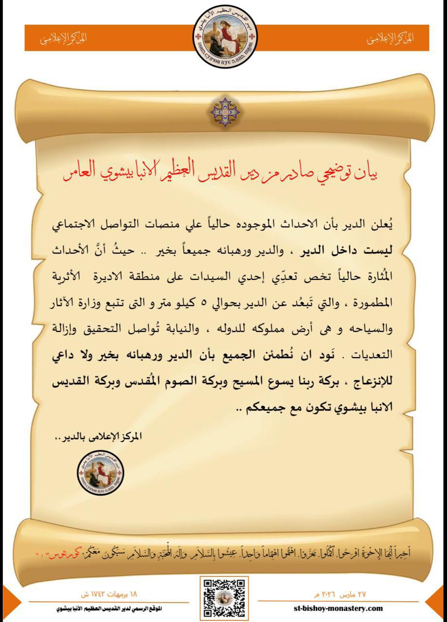 وأصدر الأنبا أغابيوس، أسقف ورئيس دير الأنبا بيشوي، بيانا يهدف إلى نشر الطمأنينة جراء الحادث الأخير، موضحاً أن الأحداث المنتشرة على التواصل الاجتماعي وقعت خارج الدير وليس داخله، وتخص تعدي إحدى السيدات على المنطقة الأثرية المطمورة التي تبعد عن الدير بحوالي 5 كيلو متر، وهي أرض مملوكة للدولة وتتبع وزارة الآثار والسياحة، وأشار إلى أن رهبان الدير بخير، والنيابة العامة لا تزال تواصل التحقيقات في ملابسات الحادث وإزالة التعديات.