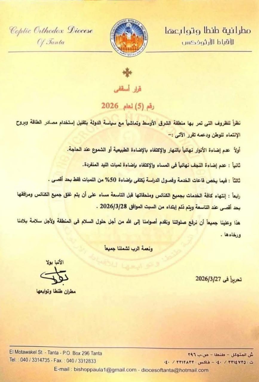 وأصدر مطران طنطا القرار رقم (5) لعام ٢٠٢٦ والذي تضمن الآتي: أولاً، عدم إضاءة الأنوار نهائياً بالنهار والاكتفاء بالإضاءة الطبيعية أو الشموع عند الحاجة، ثانياً، عدم إضاءة النجف نهائياً في المساء والاكتفاء بإضاءة لمبات الليد المنفردة، ثالثاً، فيما يخص قاعات الخدمة وفصول الدراسة يكتفى بإضاءة 50% من اللمبات فقط بحد أقصى، رابعاً، انتهاء كافة الخدمات بجميع الكنائس وملحقاتها قبل التاسعة مساء على أن يتم غلق جميع الكنائس ومرافقها بحد أقصى عند التاسعة.