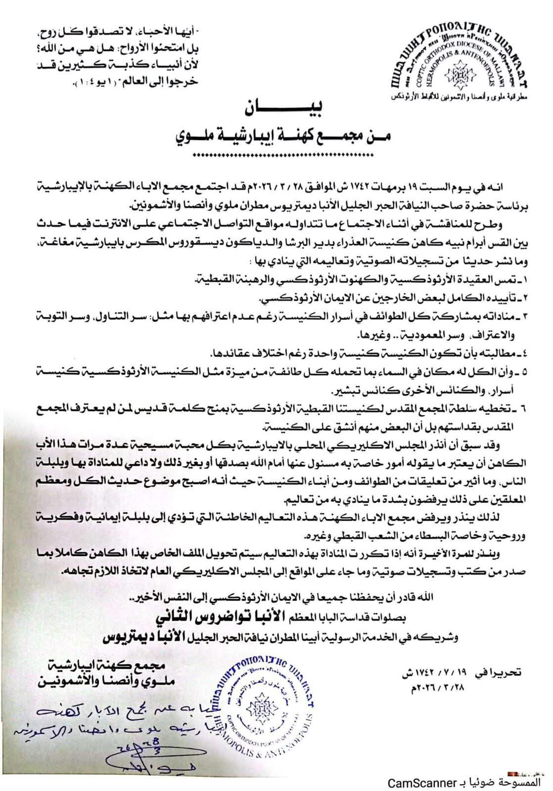 وأصدر مجمع كهنة إيبارشية ملوي بيان رسمي جاء نصه، انه في يوم السبت ۱۹ برمهات ١٧٤٢ ش الموافق ٢٨ / ٣ / ٢٠٢٦ اجتمع مجمع الاباء الكهنة بالإيبارشية برئاسة حضرة صاحب النيافة الحبر الجليل الأنبا ديمتريوس( مطران ملوي وأنصنا والأشمونين) وطرح للمناقشة في أثناء الاجتماع ما تتداوله مواقع التواصل الاجتماعي على الانترنت فيما حدث بين القس أبرام نبيه كاهن كنيسة العذراء بدير البرشا والدياكون ديسقوروس المكرس بإيبارشية مغاغة وما نشر حديثا من تسجيلاته الصوتية وتعاليمه التي ينادي بها لأنها تمس العقيدة الأرثوذكسية والكهنوت الأرثوذكسي والرهبنة القبطية وتأييده الكامل لبعض الخارجين عن الايمان الأرثوذكسي و مناداته بمشاركة كل الطوائف في أسرار الكنيسة.