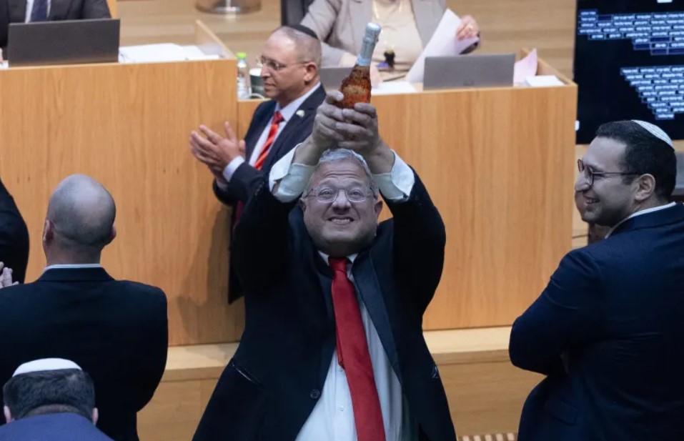 لوح إيتمار بن غفير وزير أمن الاحتلال، بزجاجة خمر "شامبانيا" ابتهاجا بإقرار قانون إعدام الأسرى الفلسطينيين في قلب الكنيست الإسرائيلي في القدس مساء أمس، معربا عن فرحه بإقرار القانون الفاشي.