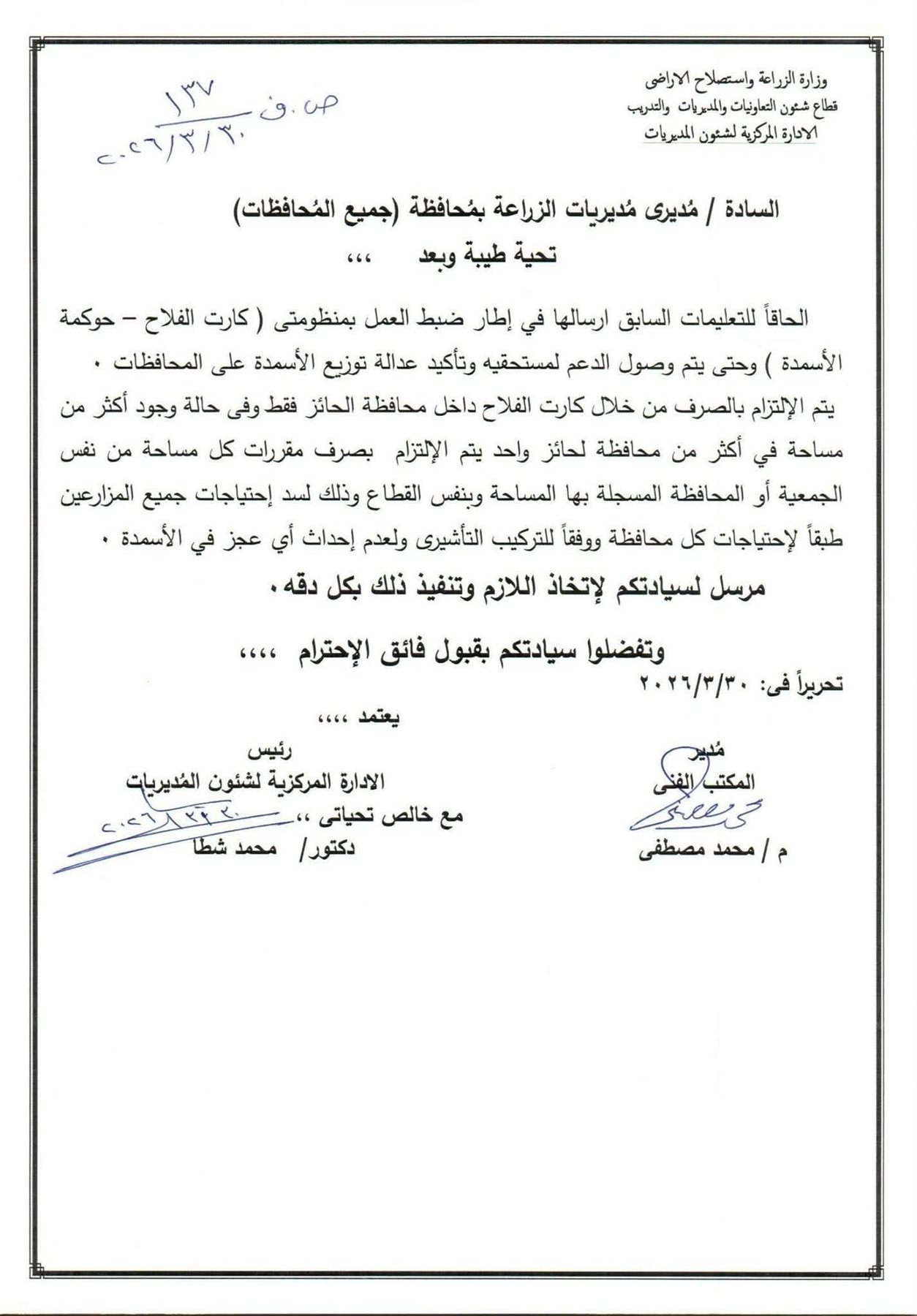 ومن جانبها، أصدرت وزارة الزراعة واستصلاح الأراضي تعليمات مشددة لمديريات الزراعة بكافة محافظات الجمهورية، تهدف إلى إعادة ضبط منظومة توزيع الأسمدة المدعمة وضمان وصول الدعم لمستحقيه الفعليين، وذلك في إطار جهود الدولة لحوكمة المنظومة الزراعية وتفعيل دور كارت الفلاح.