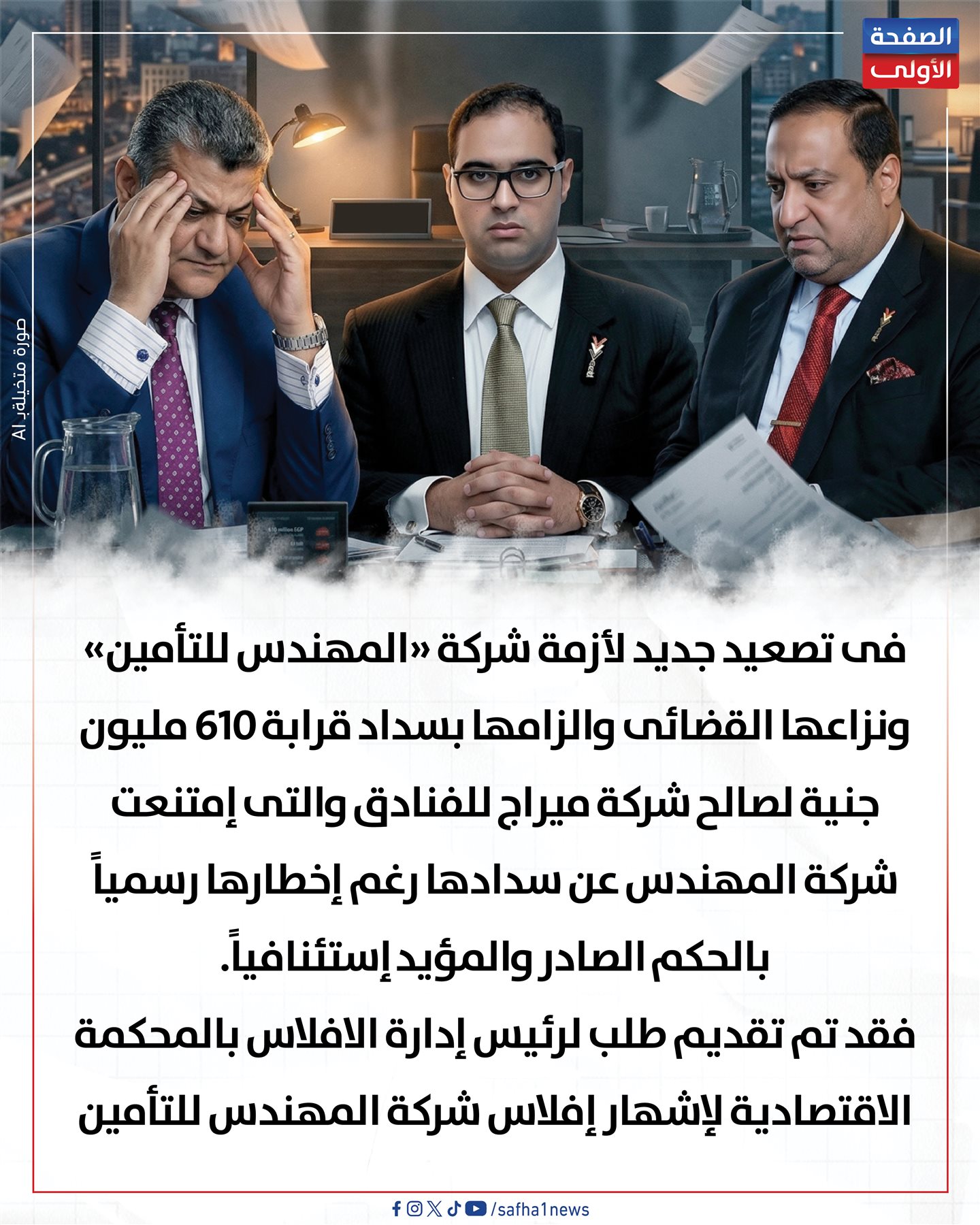 فى تصعيد جديد لأزمة شركة "المهندس للتأمين" ونزاعها القضائى والزامها بسداد قرابة 610 مليون جنية لصالح شركة ميراج للفنادق والتى إمتنعت شركة المهندس عن سدادها رغم إخطارها رسمياً بالحكم الصادر والمؤيد إستئنافياً.