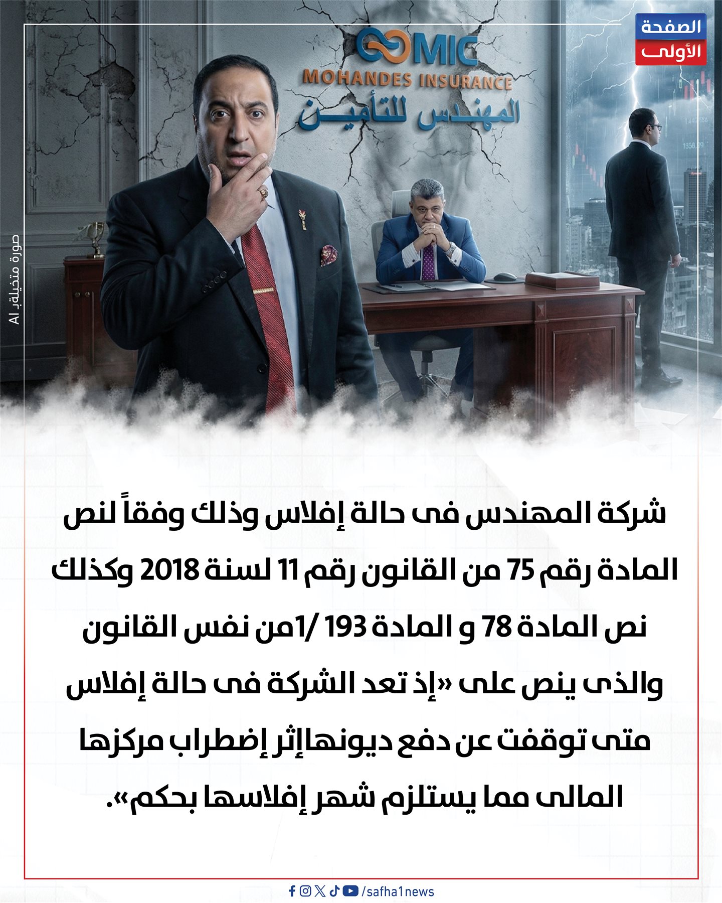 فقد تم تقديم طلب لرئيس إدارة الافلاس بالمحكمة الاقتصادية لإشهار إفلاس شركة المهندس للتأمين حمل رقم 9 لسنة 2026 وجاء فى نص الطلب أن المديونية المستحقة على شركة الهندس للتأمين تبلغ 609 مليون و 8042 الف و 614 جنيه مؤكداً أن رفض او إمتناع الشركة عن السداد ينبئ عن مركز مالى مضطرب خاصة وان النزاع تجارياً مما يعنى أن شركة المهندس فى حالة إفلاس وذلك وفقاً لنص المادة رقم 75 من القانون رقم 11 لسنة 2018 وكذلك نص المادة 78 و المادة 193 /1من نفس القانون والذى ينص على "إذ تعد الشركة فى حالة إفلاس متى توقفت عن دفع ديونهاإثر إضطراب مركزها المالى مما يستلزم شهر إفلاسها بحكم".