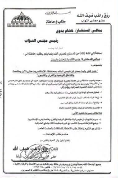 من جانبه، تقدم النائب رزق راغب ضيف الله، عضو مجلس النواب عن دائرة غرب الإسكندرية، بطلب إحاطة عاجل موجه إلى الدكتورة منال عوض وزير التنمية المحلية والبيئة، بشأن استمرار غلق باب إصدار تراخيص البناء بمحافظة الإسكندرية، محذرًا من تداعيات اجتماعية واقتصادية خطيرة نتيجة هذا التوقف المستمر، خاصة في المناطق الريفية والقرى والنجوع.