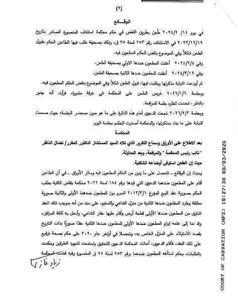 إضافة إلى أن المطعون ضدها الثانية قدمت العقد لجهة الإدارة لإدخال عداد كهرباء في العقار محل الدعوى وإقرارها بأنه يمتلك مساحة العقار وأنها قد تعاقدت على عداد للمياه بموجب التوكيل الصادر منه لها، فضلاً عن أن الربط الضريبي على المنزل باسمه منذ عام 2017 حتى تاريخه.