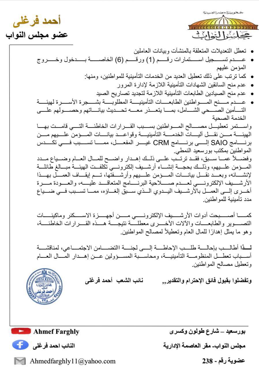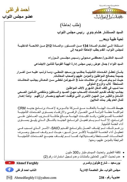 وقدم عضو مجلس النواب، أحمد فرغلي، طلب إحاطة موجه إلى الدكتور مصطفى مدبولي رئيس مجلس الوزراء واللواء جمال عوض رئيس مجلس إدارة الهيئة القومية للتأمين الاجتماعي، بشأن تعطل الخدمات التأمينية بمكتب بورسعيد النمطي، وما ترتب عليه من أضرار جسيمة بمصالح المواطنين والمؤمن عليهم وأصحاب المعاشات.