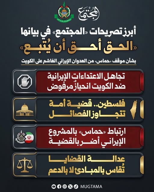 وصدر عن إخوان الكويت بيانا شديد اللهجة ، نشرته مجلة "المجتمع" المقربة من اخوان الكويت، ردا على المتحدث باسم حماس، أكد بيان إخوان الكويت أن كل خطابٍ لا يُدين الاعتداءات الإيرانية الآثمة صراحةً يُعدّ موقفاً مرفوضاً لا يمكن قبوله أو تبريره.