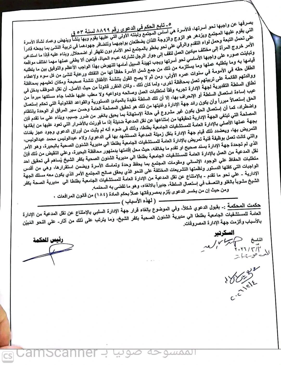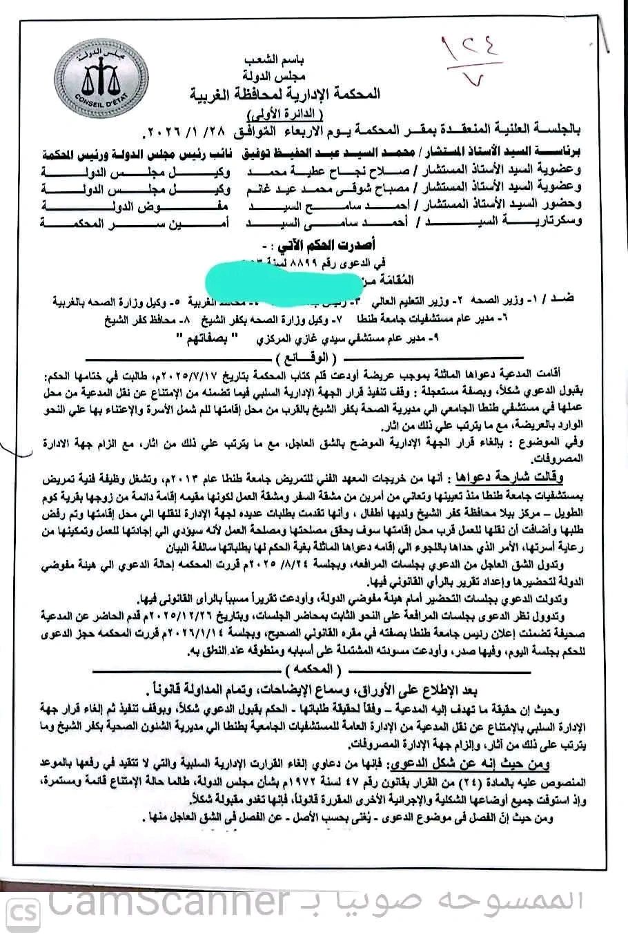 وجاء الحكم الصادر من المحكمة الإدارية لمحافظة الغربية الدائرة الأولى، في الدعوى رقم 8899 لسنة 53 ق، الصادر بتاريخ 28 يناير 2026، في الدعوى المقامة ضد وزير الصحة، وزير التعليم العالي، محافظ الغربية، مدير عام مستشفيات جامعة طنطا - وكيل وزارة الصحة بكفر الشيخ - محافظ كفر الشيخ، مدير عام مستشفى سيدي غازي المركزي "بصفاتهم".