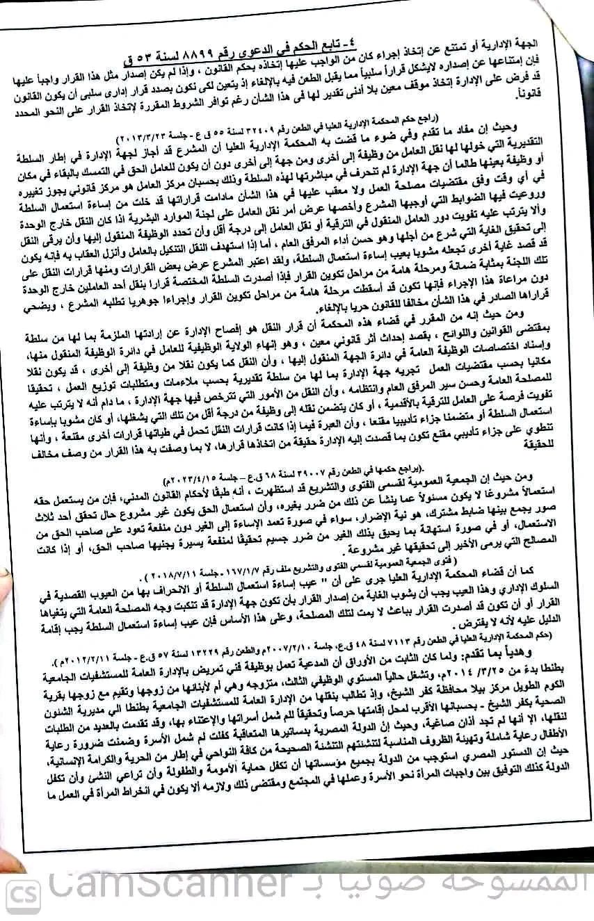 وبناء على ما تقدم، فإن المصلحة التي تبتغي الجهة الإدارية تحقيقها من امتناعها عن نقل المدعية ضئيلة إذا ما قورنت بالأضرار التي تعود عليها من إبقائها بجهة عملها الأصلي بالإدارة العامة للمستشفيات الجامعية بطنطا، وذلك في ضوء أنه لم يثبت من أوراق الدعوى وجود عجز بفئات التمريض بها، ويعضد ذلك قيام جهة الإدارة بنقل زميلة المدعية المستشهد بها في الدعوى والتي كانت تعمل بوظيفة فنية تمريض بالإدارة العامة للمستشفيات الجامعية بطنطا إلى مديرية الشؤون الصحية بالبحيرة.