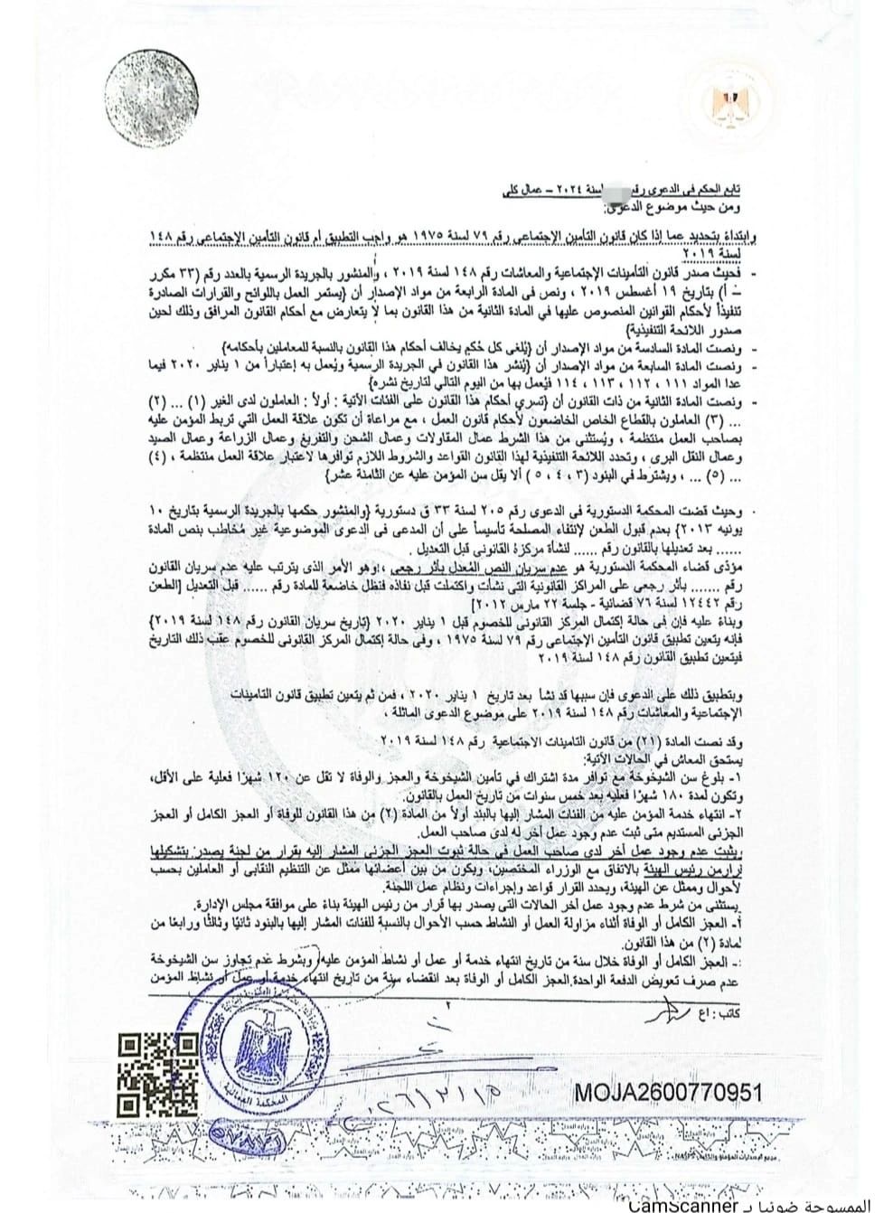 واستندت الدعوى بشكل أساسي إلى قانون التأمينات الاجتماعية والمعاشات الجديد رقم 148 لسنة 2019، وتحديدا المادة 100 التي تحدد شروط استحقاق الابنة للمعاش "ألا تكون متزوجة"، والمادة 107: التي تنظم حالات قطع المعاش ومنها الالتحاق بعمل يدر دخلاً يساوي أو يزيد عن المعاش، وإلى اللائحة التنفيذية للقانون التي تنص صراحة على أن المعاش الذي قطع بسبب العمل يُعاد صرفه بمجرد ترك الخدمة أو العمل.