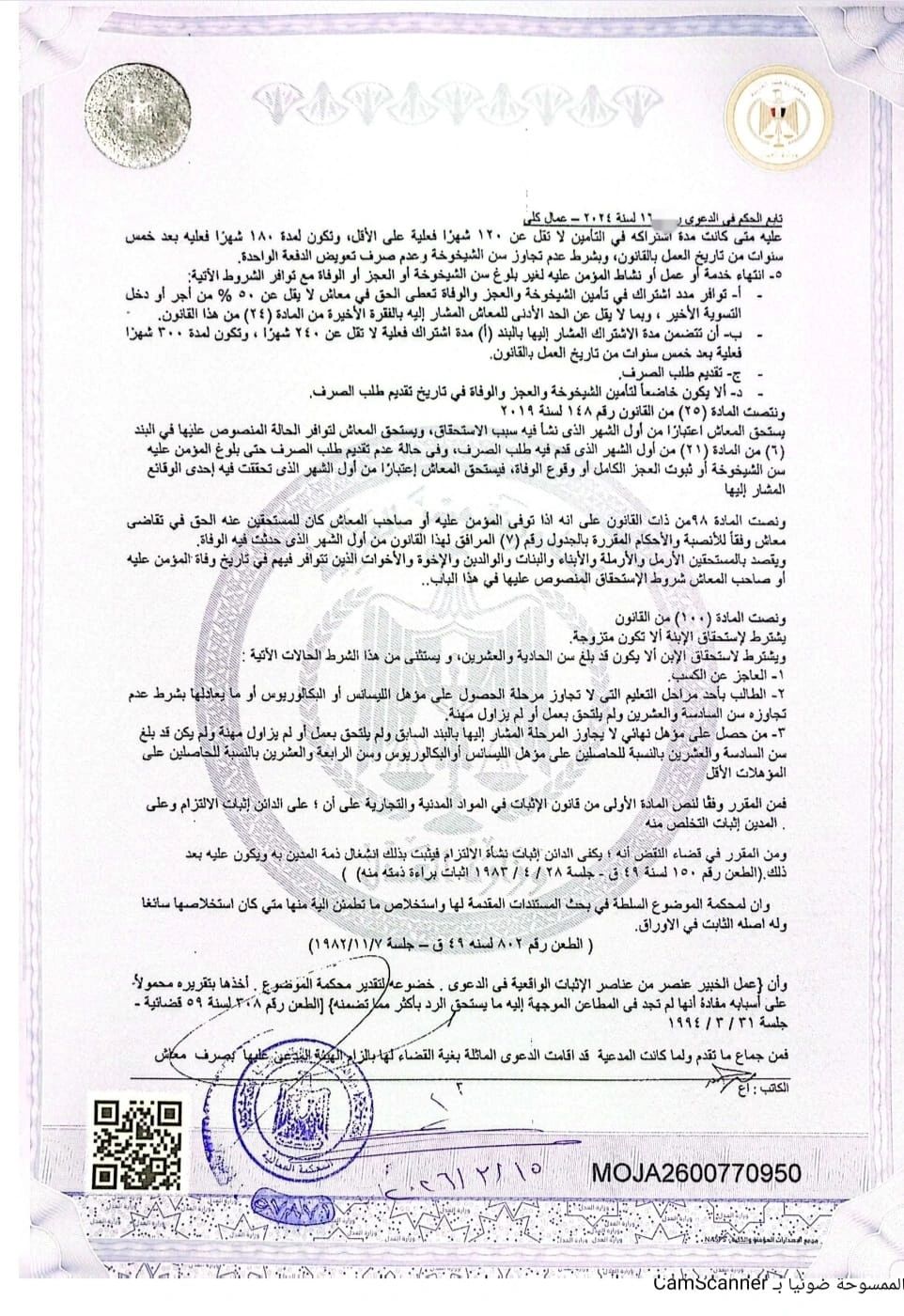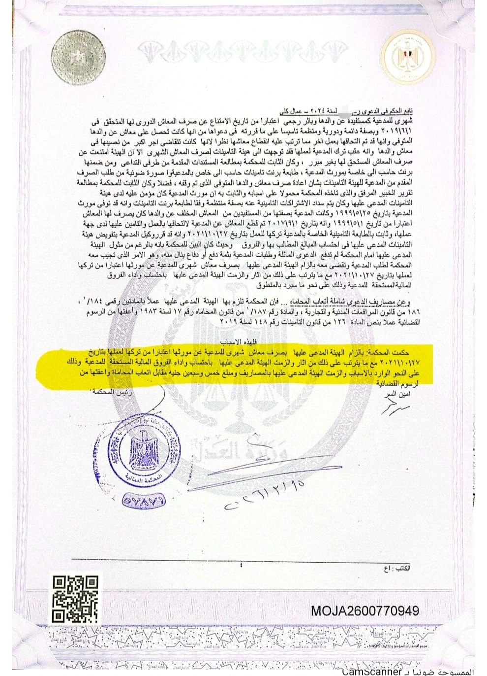 وكانت الابنة المستفيدة، رفعت دعوى ضد الهيئة القومية للتأمين الاجتماعي، تطالب فيها بصرف معاش والدها المتوفى المتوقف منذ عام 2019، وذلك بعدما قطعت الهيئة المعاش بسبب التحاقها بعمل، ولكنها عندما تركت العمل وتقدمت لإعادة الصرف، فواجهت رفضا ومماطلة من الهيئة، ما دفعها للجوء للقضاء.
