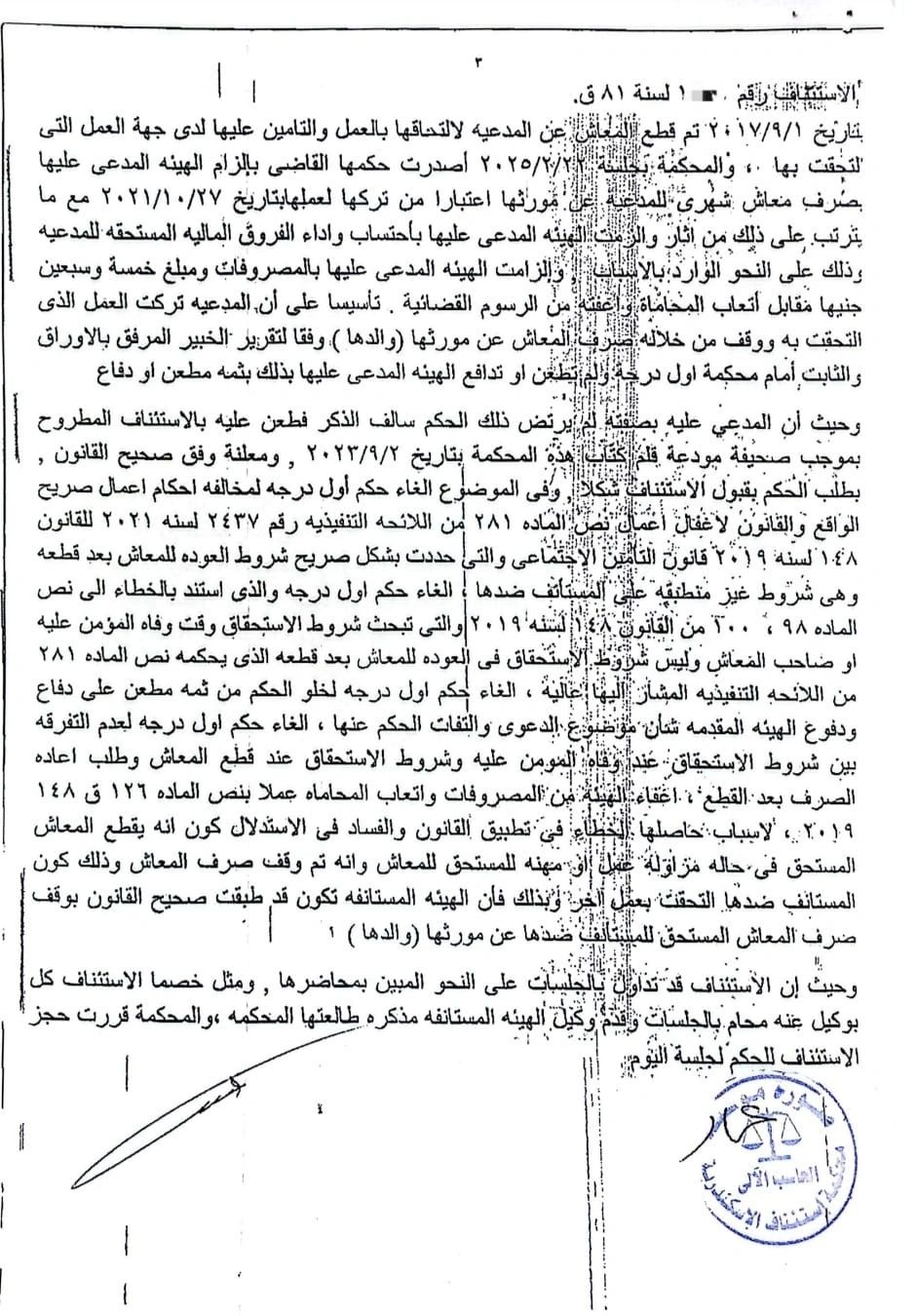 وجاء منطوق حكم أول درجة: حكمت المحكمة بإلزام الهيئة المدعى عليها بصرف معاش شهري للمدعية عن مورثها اعتباراً من تاريخ تركها لعملها في 27/10/2021، مع ما يترتب على ذلك من آثار وفروق مالية، وإلزام الهيئة بالمصاريف.
